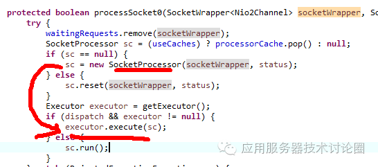 processSocket0的方法就是开启工作线程,初始化一个SocketProcessor处理类,然后调用Tomcat的线程池一个线程进行执行: