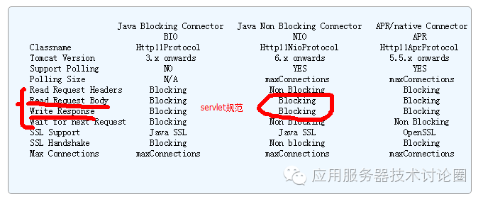 NIO中,只有读取http header的时候,进行socketChannel.read操作,而对于http body的读取,Servlet流的写入等还是采用BIO这种读写方式,因为这个是Servlet的规范要求的,可以看看下面的表格对比: