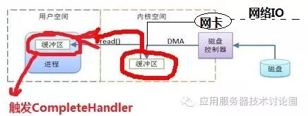 2.对于内核分离器通知CompleteHandler的时机是什么,对比NIO的缓冲区,实质是当内核态缓冲区的数据已经复制到用户态缓冲区时候,这个时候触发CompleteHandler,这相当于比NIO的模式更进一步: