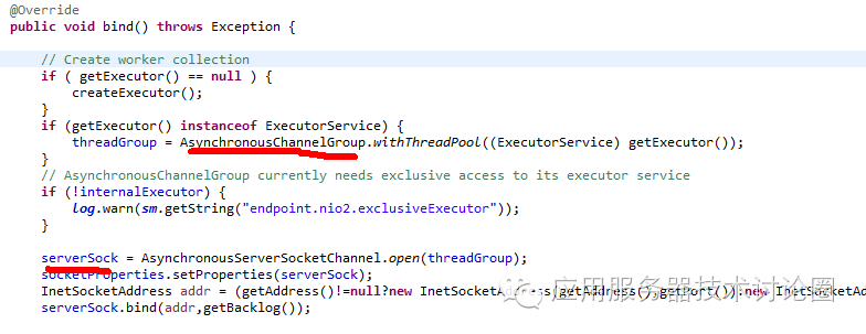 从代码的角度来看看,Tomcat的NIO2的通道,主要集中在NIO2Endpoint这个类的bind方法: