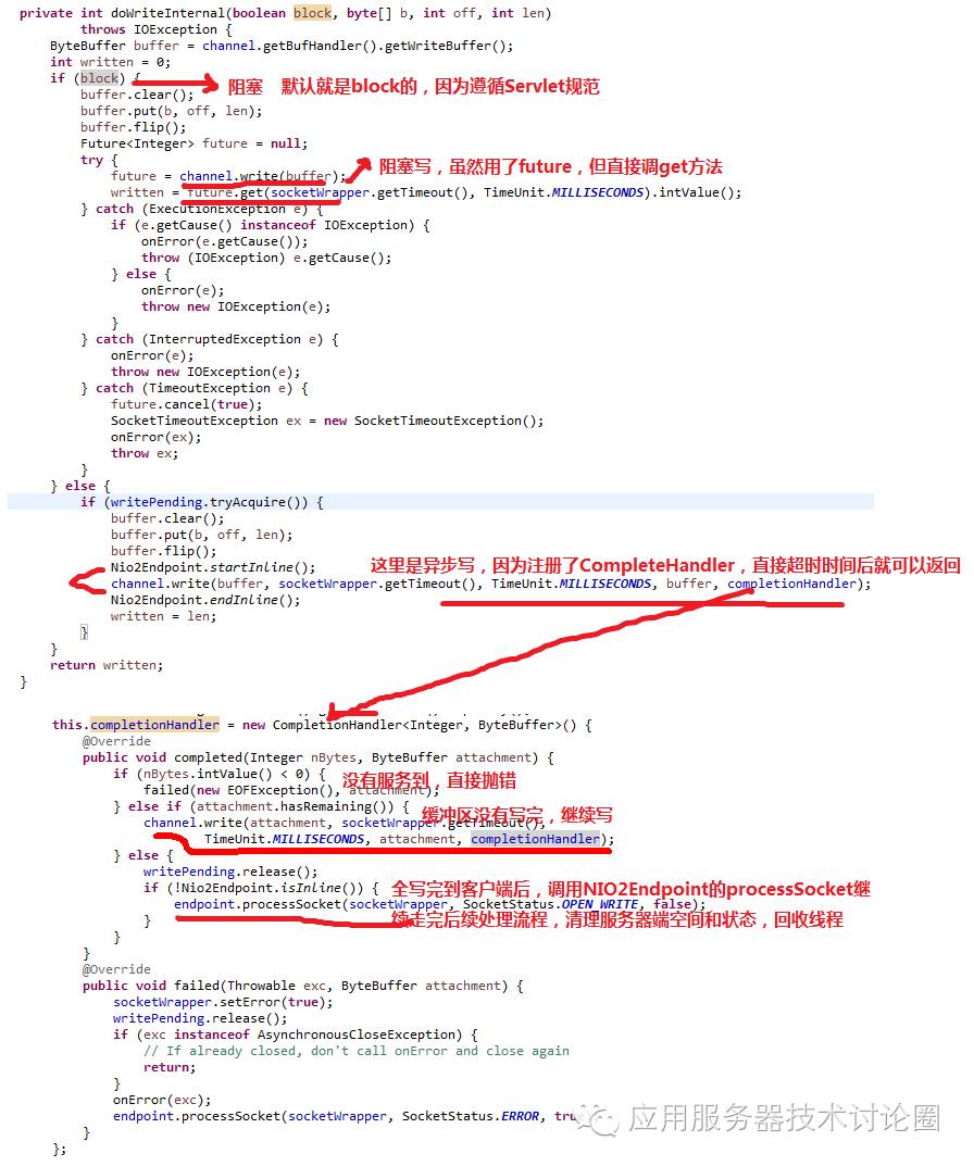 对于ServletOutPutStream来说,从Servlet的规范角度就是阻塞写的,上述代码中block是默认的,在阻塞写的过程中,也使用了AsynchronousChannel进行write,只不过这个write之后获得的future,直接就get阻塞住,一直等到数据写完为止;
