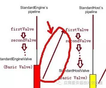 作为StandardEngine的BaseValve来说,其主要是通过request找到虚拟主机,然后执行虚拟主机Host中配置的第一个Valve,也就是下图中的箭头所指: