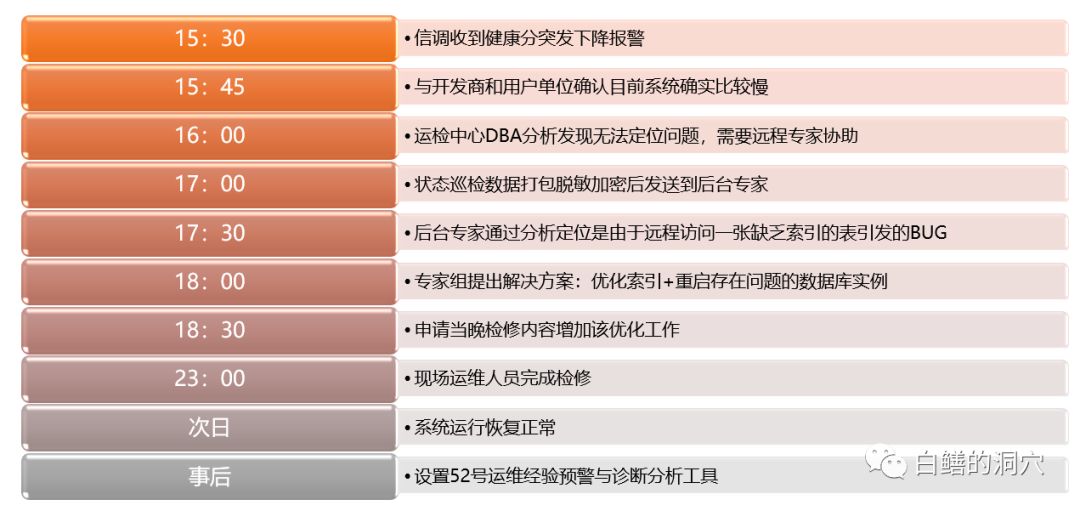 其实这种情况在我们日常的运维工作中十分容易出现,现场工程师一般来说处置复杂问题的能力较弱,而三线工程师如果无法直接连到用户生产系统上,要分析系统的问题也存在一定的难度,现场工程师与三线人员无法在同一个平面上进行对话,无法拥有共同的思维方式。健康管理工具与“状态巡检报告”把这一些分析工作程序化了,现场与三线专家拥有同样的数据,采取同样的维度分析方法去看数据。这样二者之间的互动效果将会大大加强,故障定位的速度也会大大提升。