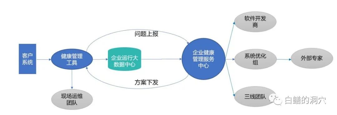 如果中间无法形成闭环,网络不通,无法建立企业健康管理服务中心,那么用户的数据可以通过工具经过脱敏加密后通过邮件发送给三线专家,三线专家可以将数据导入后在三线数据中心使用工具对数据进行分析与处理。比较简单的问题直接通过生成”状态巡检报告“发送给三线专家,三线专家就可以完成分析了。