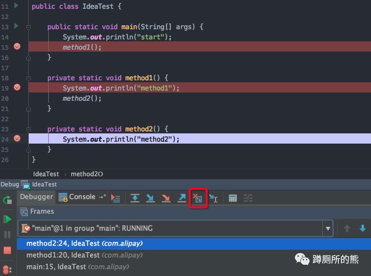 ,会发现光标所在的24行突然跳到了20行(method2的开始调用处),如果再点击一下,光标就会跳到15行(method1的开始调用处)