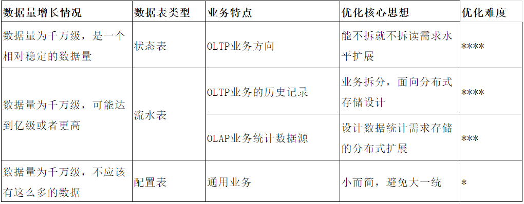 至此,我们可以对整体的背景有一个认识了,如果要做优化,其实要面对的是这样的 3*3 的矩阵,如果要考虑表的读写比例(读多写少,读少写多...),那么就会是 3*3*4=24 种,显然做穷举是不显示的,而且也完全没有必要,可以针对不同的数据存储特性和业务特点来指定不同的业务策略。