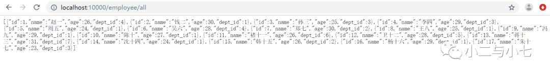 package com.xiaoqi.controller;import com.xiaoqi.domain.Employee;import com.xiaoqi.service.impl.EmployeeServiceImpl;import org.springframework.beans.factory.annotation.Autowired;import org.springframework.web.bind.annotation.*;import java.util.List;@RestController@RequestMapping("/employee")public class EmployeeController {@Autowiredprivate EmployeeServiceImpl service;@GetMapping("/all")public List<Employee> findAll(){return service.findAll();}}