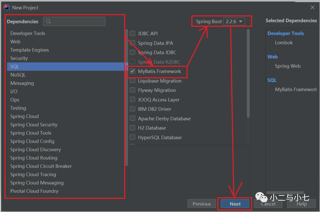 选择需要的依赖(我在这选择了web,lombook,mybatis,springboot版本,在此只是做个演示,我也不喜欢这种方式),然后next。