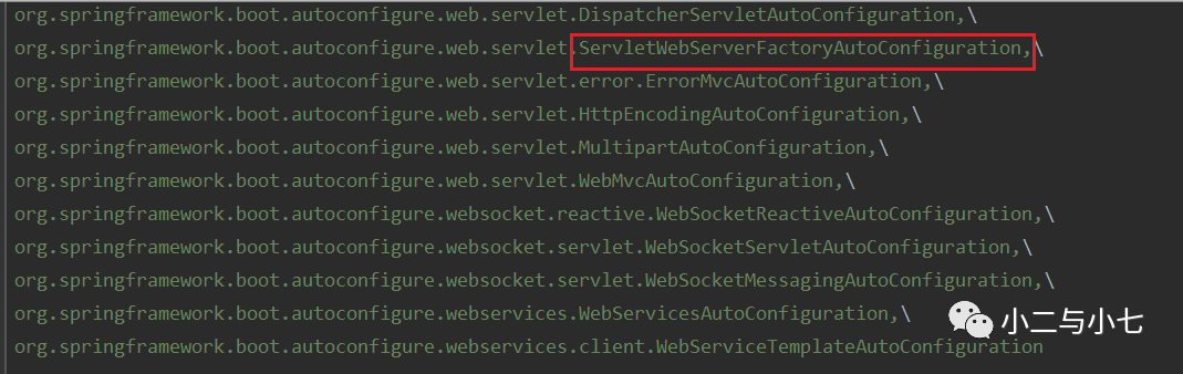 最后在茫茫多的依赖中找到了这个文件,这个文件里以Configuration结尾的类名称都是存有自动配置信息的类,而 SpringApplication先获取这些类名后再加载