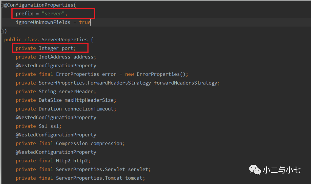 @EnableConfigurationProperties(ServerProperties.class) 代表加载ServerProperties服务器配置属性类,其部分源码如下: