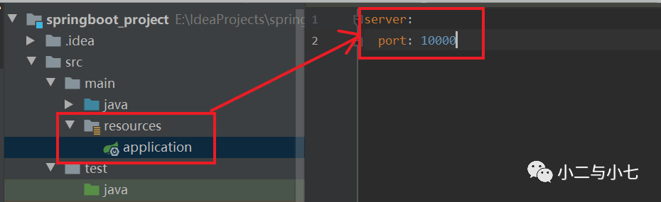 prefix = "server"表示SpringBoot配置文件中的前缀,SpringBoot会将配置文件中以server开始的属性映射到该类的对应字段中,比如我们修改这个端口号为10000,maven工程在resources目录下定义配置文件(properties和yaml文件都可以)。