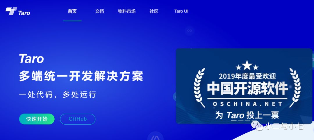 (1)Taro官网:https://taro.aotu.io/,Taro 是一套遵循React语法规范的多端开发解决方案,使用 Taro,我们可以只书写一套代码,再通过 Taro 的编译工具,将源代码分别编译出可以在不同端(微信/百度/支付宝/字节跳动/QQ/京东小程序、快应用、H5、React-Native 等)运行的代码,下面是它的官网截图,一处代码,多出运行,真的是很熟悉的口号。
