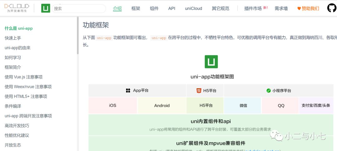 (2)uni-app官网:https://uniapp.dcloud.io/,uni-app是一个使用Vue.js开发所有前端应用的框架,开发者编写一套代码,可发布到iOS、Android、H5、以及各种小程序(微信/支付宝/百度/头条/QQ/钉钉)等多个平台。