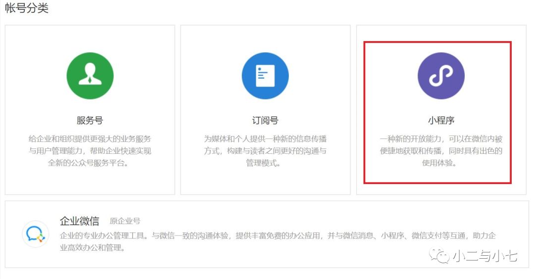 (1)注册一个微信开发账号,前往微信公众平台官网,选择小程序,进行账号注册,注册完成后微信会为我们生成一个AppId,创建小程序项目时会用到,如下图。