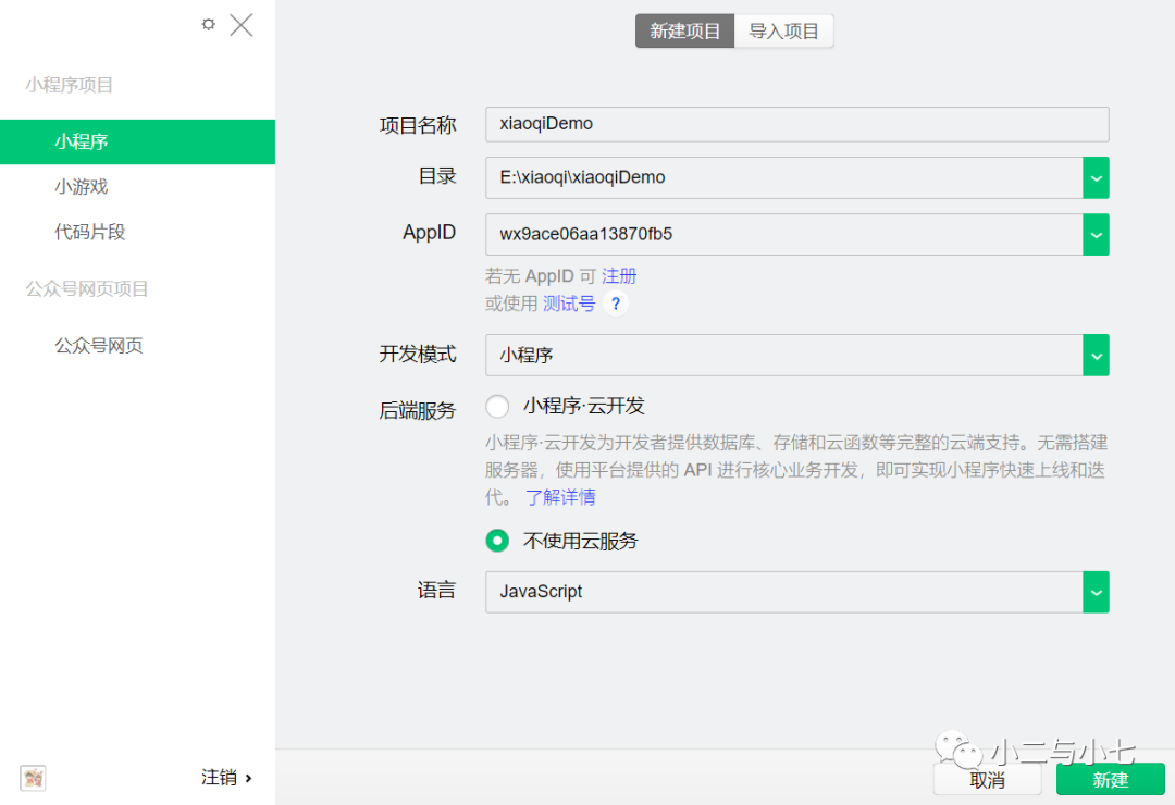 项目名称可以随意,指定目录时需要指定一个空的目录,AppId小程序注册后都会有,第一次先不使用云开发创建项目。