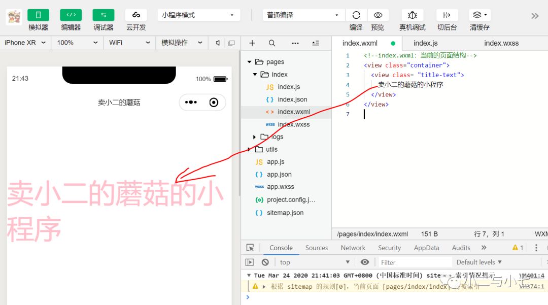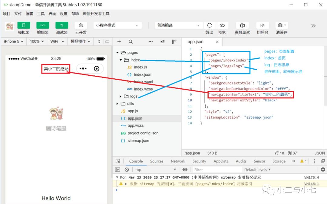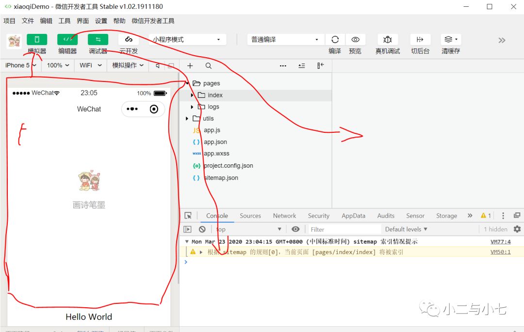 微信会生成一个hello world示例模板,上图中箭头分别对应的是模拟器,编辑器和调试器,中间是项目的目录结构。