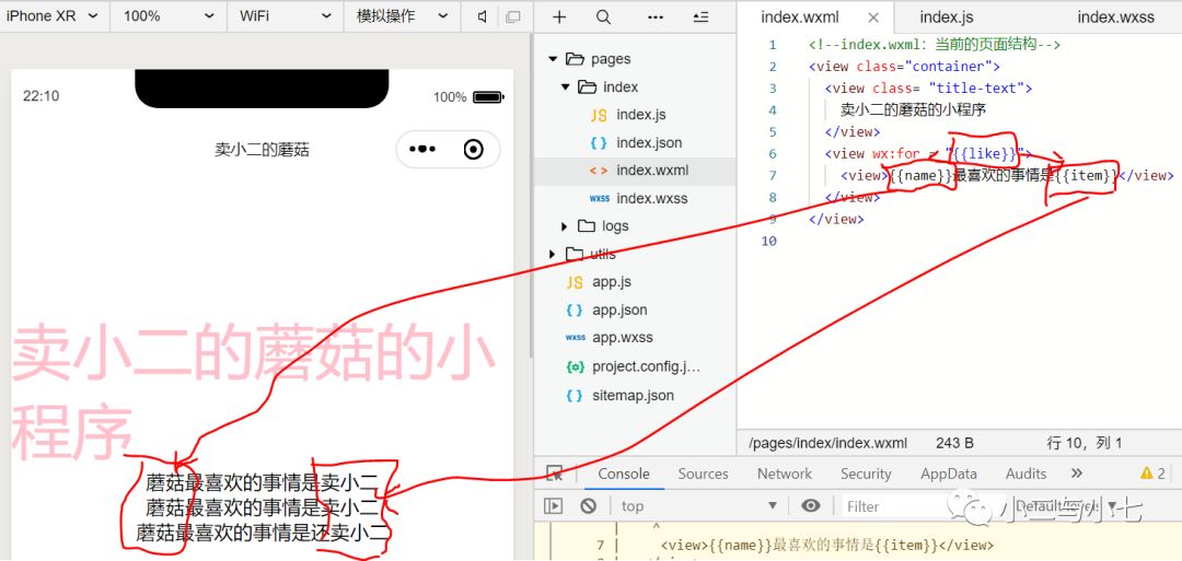 <view>{{name}}最喜欢的事情是{{item}}</view> <!-- item获取数组中的每个元素-->