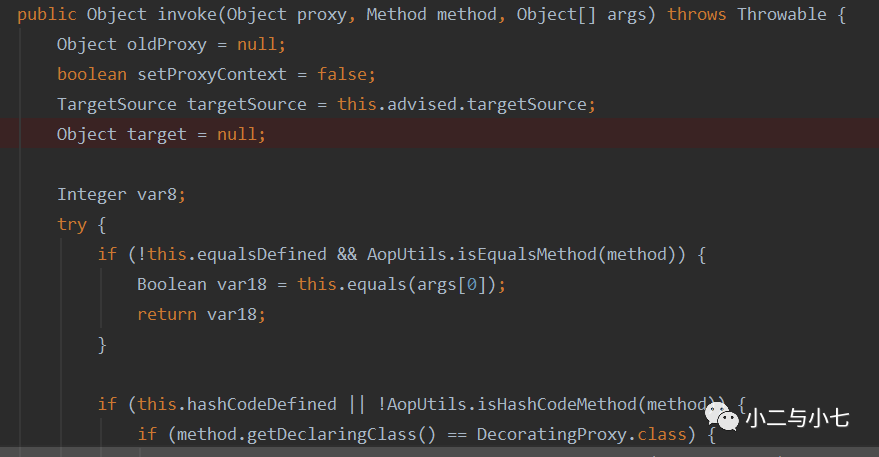 可以看到它实现了InvocationHandler这个接口,那么可以证实了它确实是通过动态代理实现的,其实Spring AOP就是通过JdkDynamicAopProxy帮助我们使用动态代理的方式创建对象的,那么我们直接找到它实现的invoke方法如下,