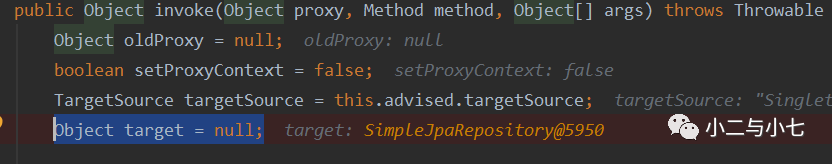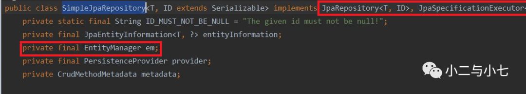 此处的target的值已经变成了SimpleJpaRepository,那么这个代理对象到这里就已经产生了,我们看它的源码,可以阿卡难道它实现了JpaRepository和JpaSpecificationExcutor这两个接口,而我们在创建Dao接口的时候就继承了它们,所以SimpleJpaRepository也可以看成是我们的Dao的一个实现类,还有em这个变量需要关注一下,他是实体类的管理工具。