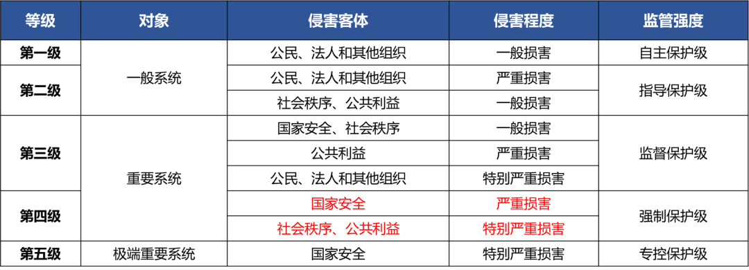 等保2.0标准共分为五级,安全保护等级越高,代表安全保护能力越强。具体分级要求参考下图: