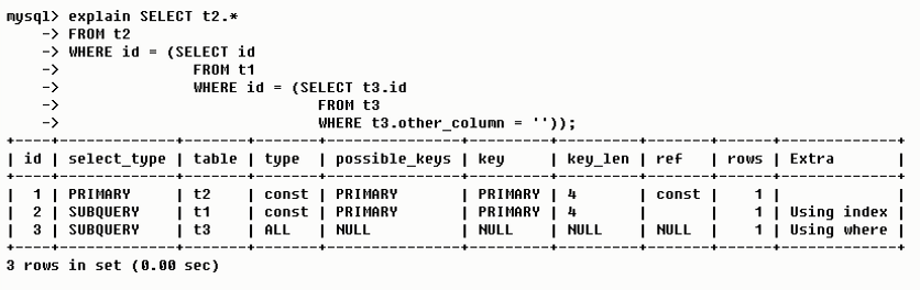 system > const > eq_ref > ref > fulltext > ref_or_null > index_merge > unique_subquery > index_subquery > range > index > ALL