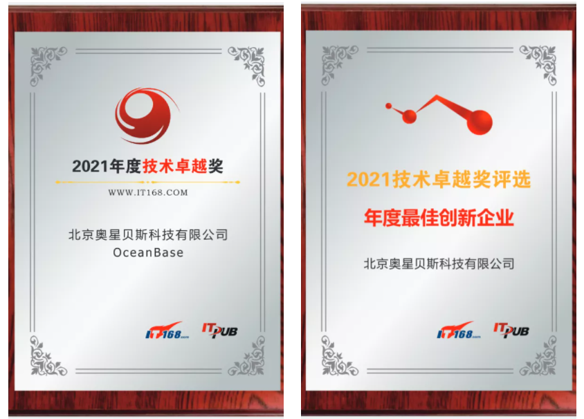 12月17日,知名行业媒体 IT168 正式对外公布了2021年度“技术卓越奖”的评选结果,企业级原生分布式数据库 OceanBase 斩获“2021年度技术卓越奖”,北京奥星贝斯科技有限公司荣获“2021年度最佳创新企业”。值得一提的是,2021年是 OceanBase 连续第三年获得“技术卓越奖”奖项。