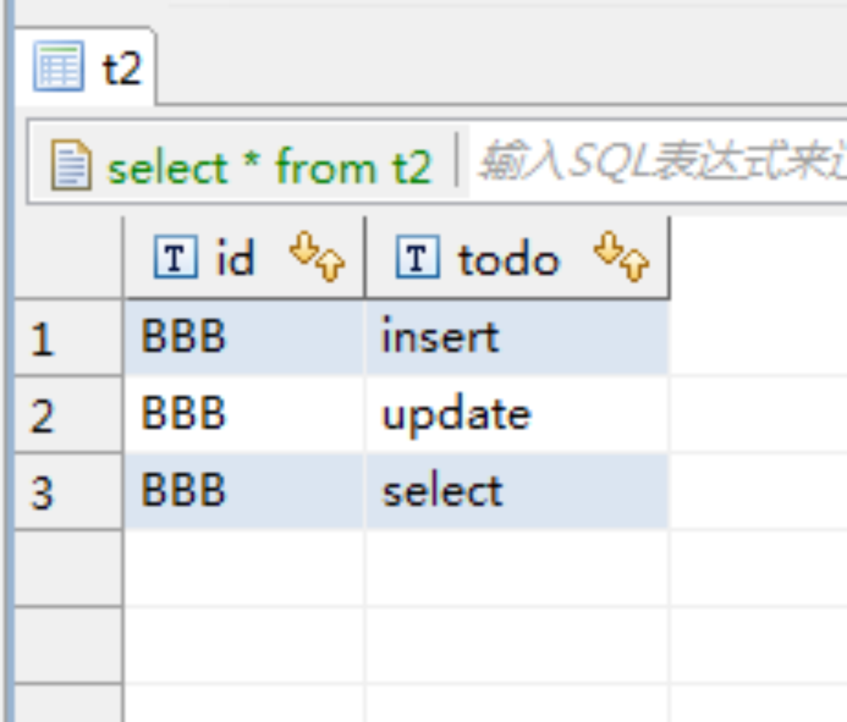 执行期待的结果,t1表中,修改一条记录,并且触发修改操作触发器,插入一条记录在t2日志表。