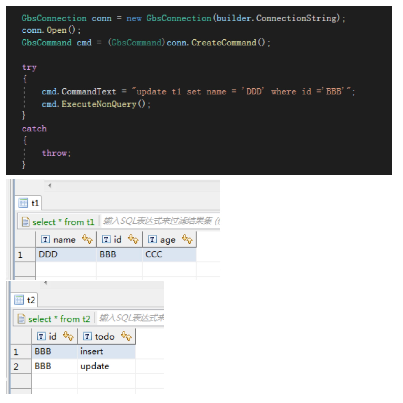 cmd.CommandText = "update t1 set name = 'DDD' where id ='BBB'";
