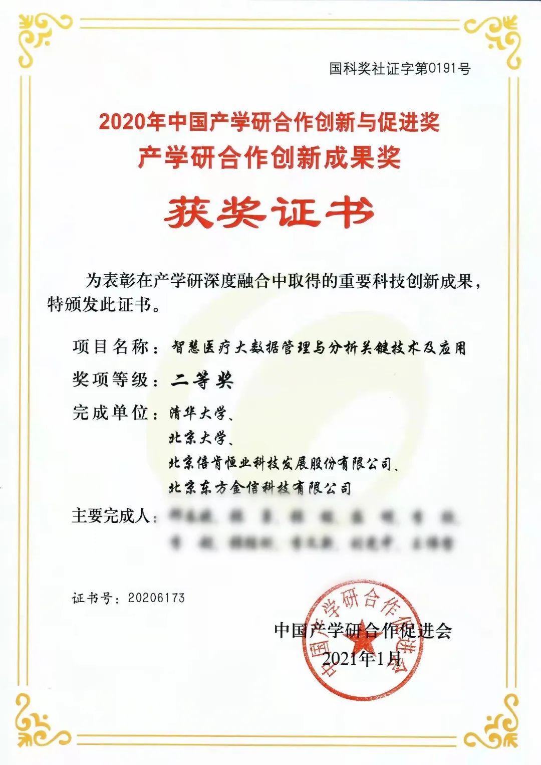 东方金信与清华大学、北京大学等单位联合申报的“智慧医疗大数据管理与分析关键技术应用” 荣获2020年中国产学研合作创新与促进奖-产学研合作创新成果二等奖。董事长王伟哲为该项目主要完成人。