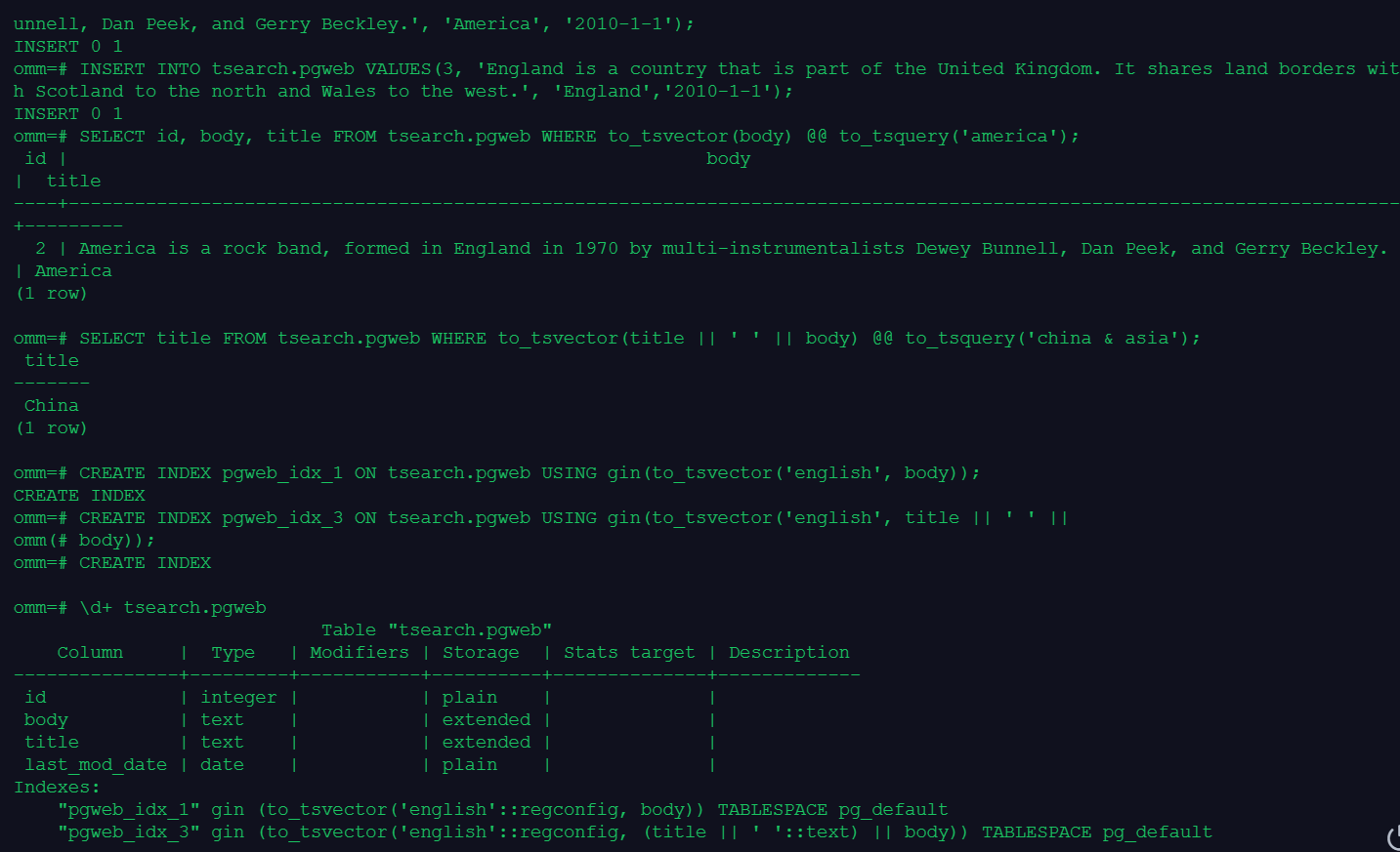 omm=# create index gin_index on text_table using gin(to_tsvector('english',title));