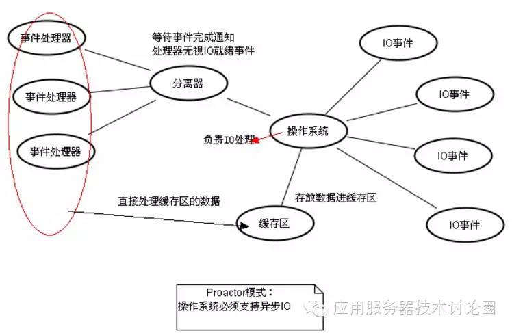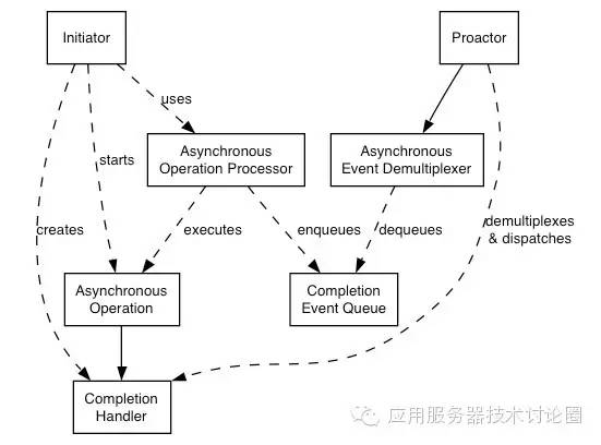 应用服务器前端使用Proactor模式,与操作系统之间的回调是在事件完成之后,这与Reactor是完全不同的,Reactor是在IO准备就绪的时候来回调事件,