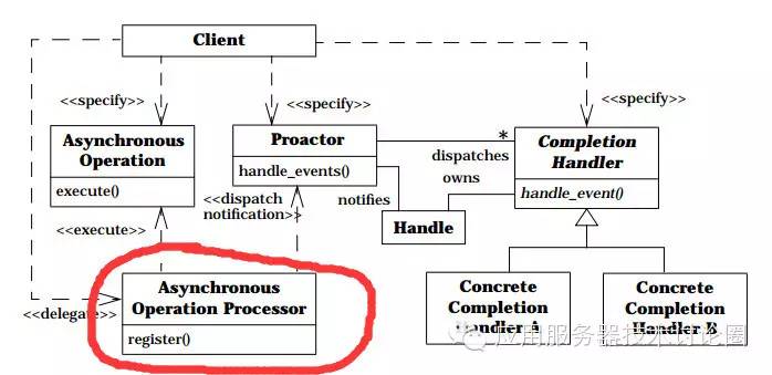 和Reactor类图基本上是相差无几,但是图中多出了一个Asynchronous Operation Process,异步操作执行器这个组件,这个多余出来的东西就是二者之间的区别。