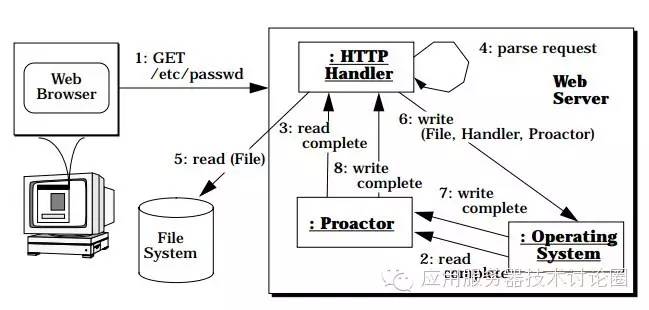对于Proactor来说,需要处理对应得是完成事件,以下图的典型的浏览器应用为例: