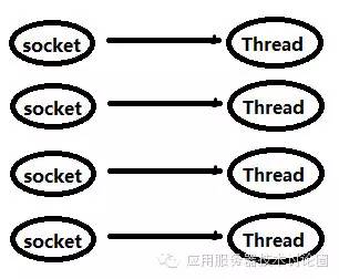 这种模式的好处,是思路很清晰,一个线程处理一个socket请求,但是这种太消耗线程资源,因为毕竟socket不是实时都有数据接入的,