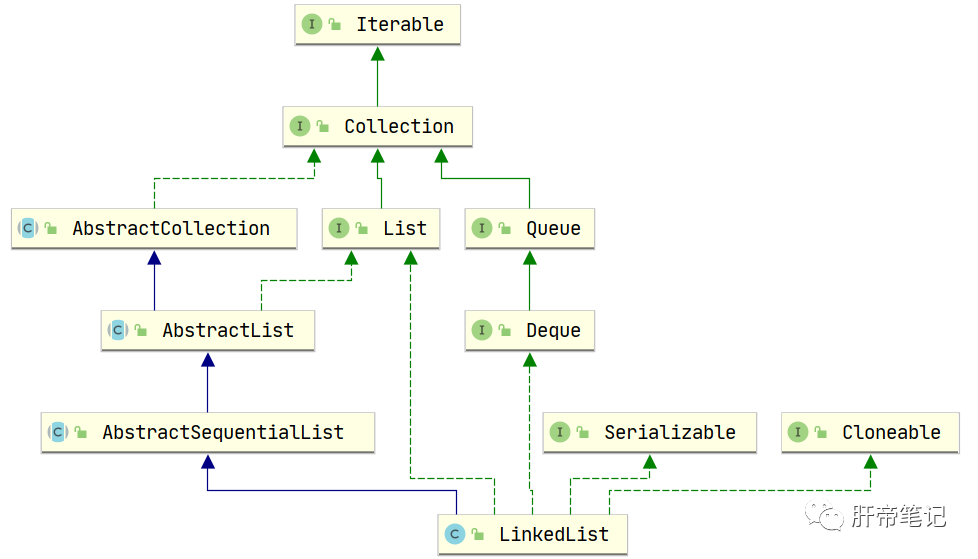继承了抽象类AbstractSequentialList类,追根到底还是实现了Collection接口。 实现了List接口,则表明LinkedList具有数组的数据结构。 实现了Deque接口,则表明LinkedList具有队列的数据结构。 实现标记接口Cloneable,表明LinkedList可被克隆。实现这个接口后,然后在类中重写Object中的clone方法,然后通过类调用clone方法才能克隆成功,如果不实现这个接口,则会抛出CloneNotSupportedException(克隆不被支持)异常。 实现标记接口Serializable,可被序列化和反序列化。