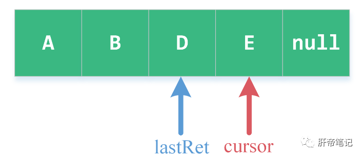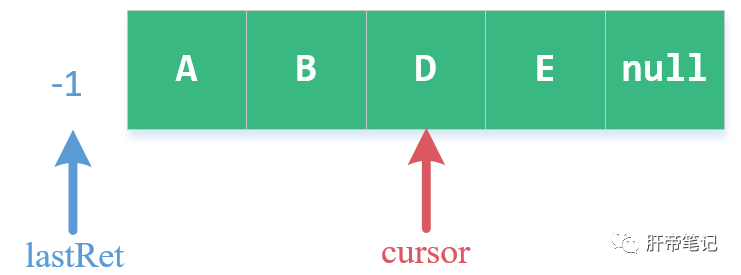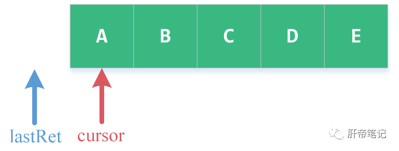 ①在上面错误实例代码中,初始情况如下图所示,在开始遍历之前,lastRet指向-1的位置,cursor指向第一个元素。