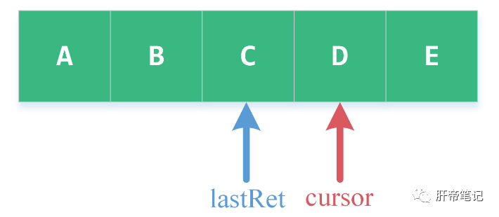 ②当next()方法获取到元素C的时候,此时lastRet指向索引为2的元素C,cursor指向索引位3的元素D。