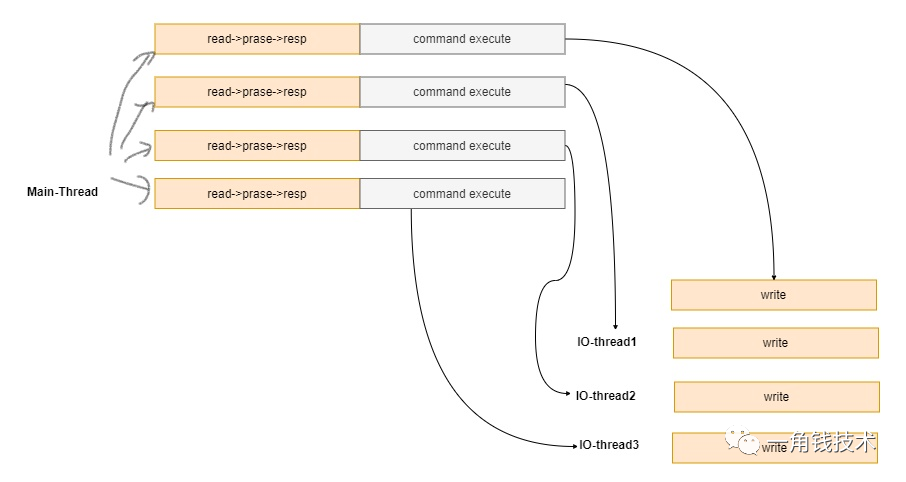 默认情况下,如上配置,有三个IO线程, 这三个IO线程只会执行 IO中的write 操作,也就是说,read 和 命令执行 都由main线程执行。最后多线程将数据写回到客户端。