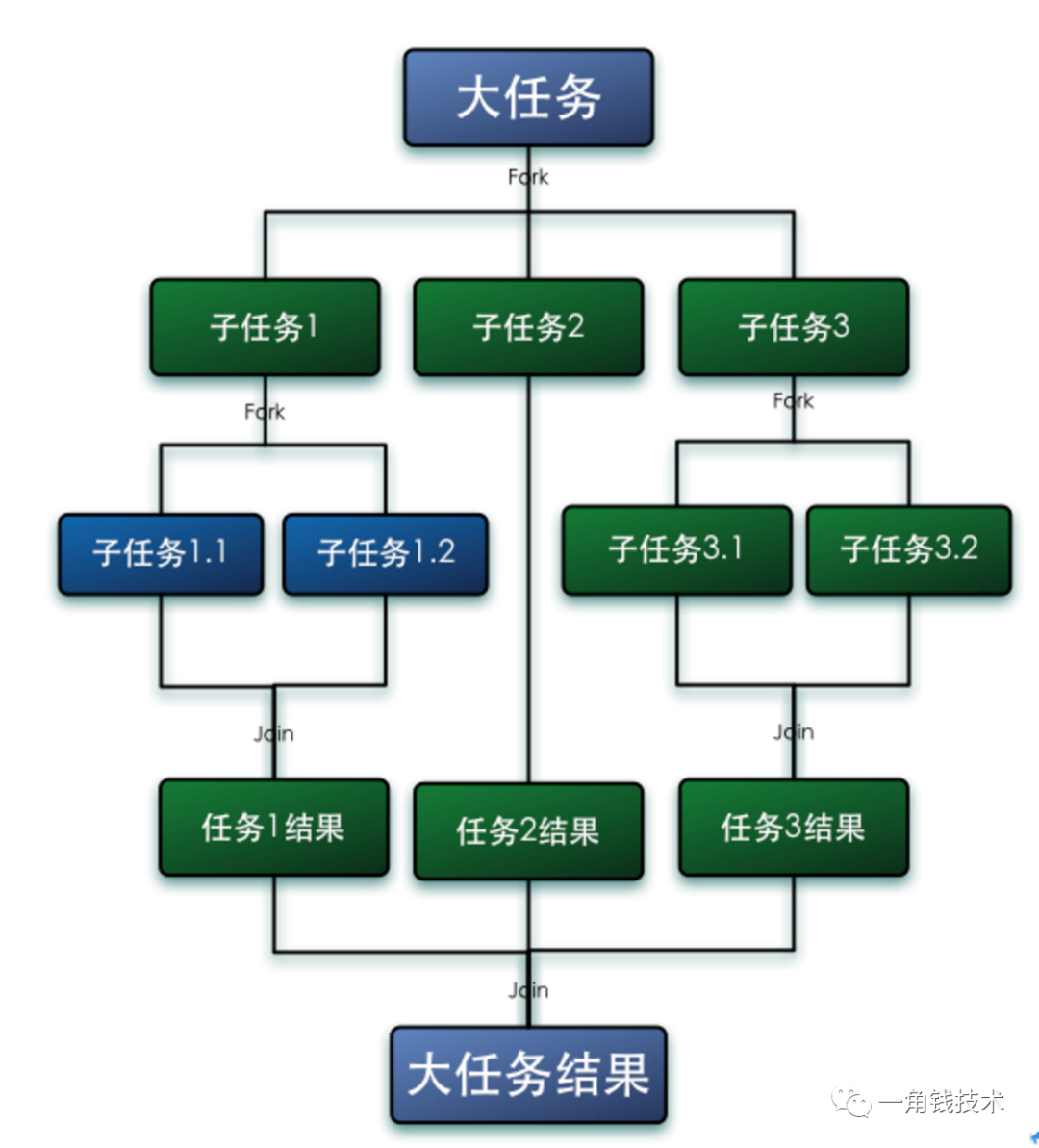Fork 就是把一个大任务切分为若干个子任务并行的执行,Join 就是合并这些子任务的执行结果,最后得到这个大任务的结果。比如计算 1+2+......+10000,可以分割成10个子任务,每个子任务对1000个数进行求和,最终汇总这10个子任务的结果。如下图所示: