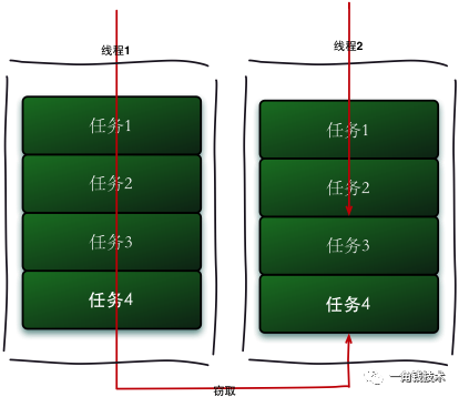 但是有的线程会先把自己队列里的任务干完,而其他线程对应的队列里还有任务等待处理。干完活的线程与其等着,不如去帮其他线程干活,于是它就去其他线程的队列里窃取一个任务来执行。而在这时它们会访问同一个队列,所以为了减少窃取任务线程和被窃取任务线程之间的竞争,通常会使用双端队列,被窃取任务线程永远从双端队列的头部拿任务执行,而窃取任务的线程永远从双端队列的尾部拿任务执行。