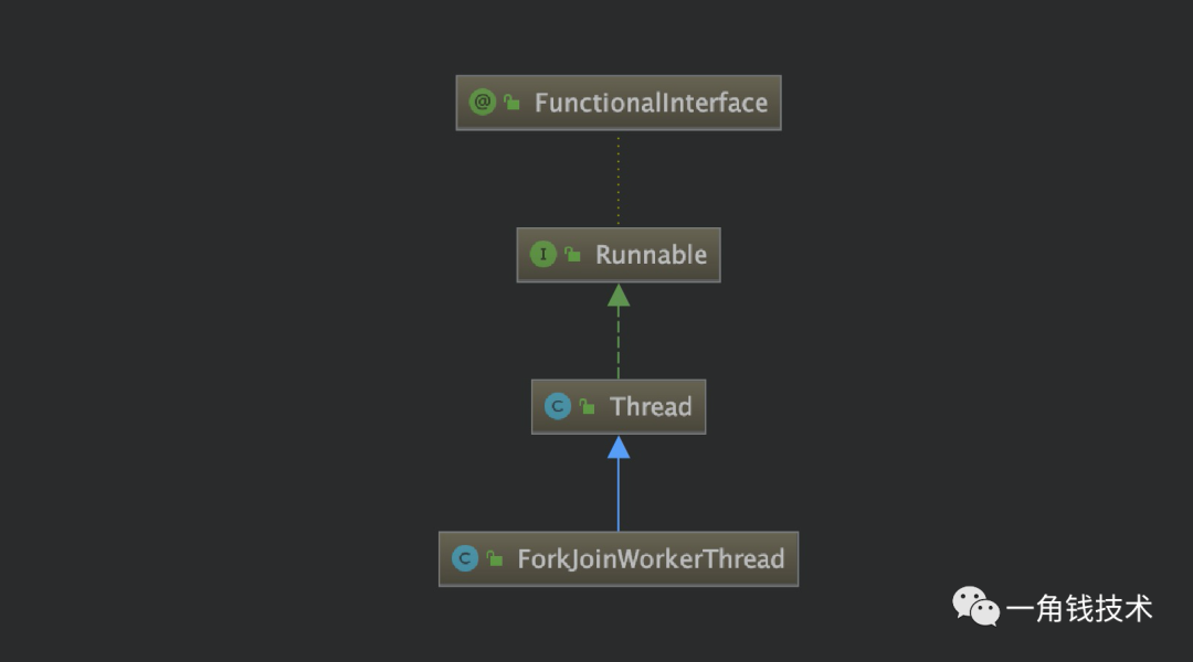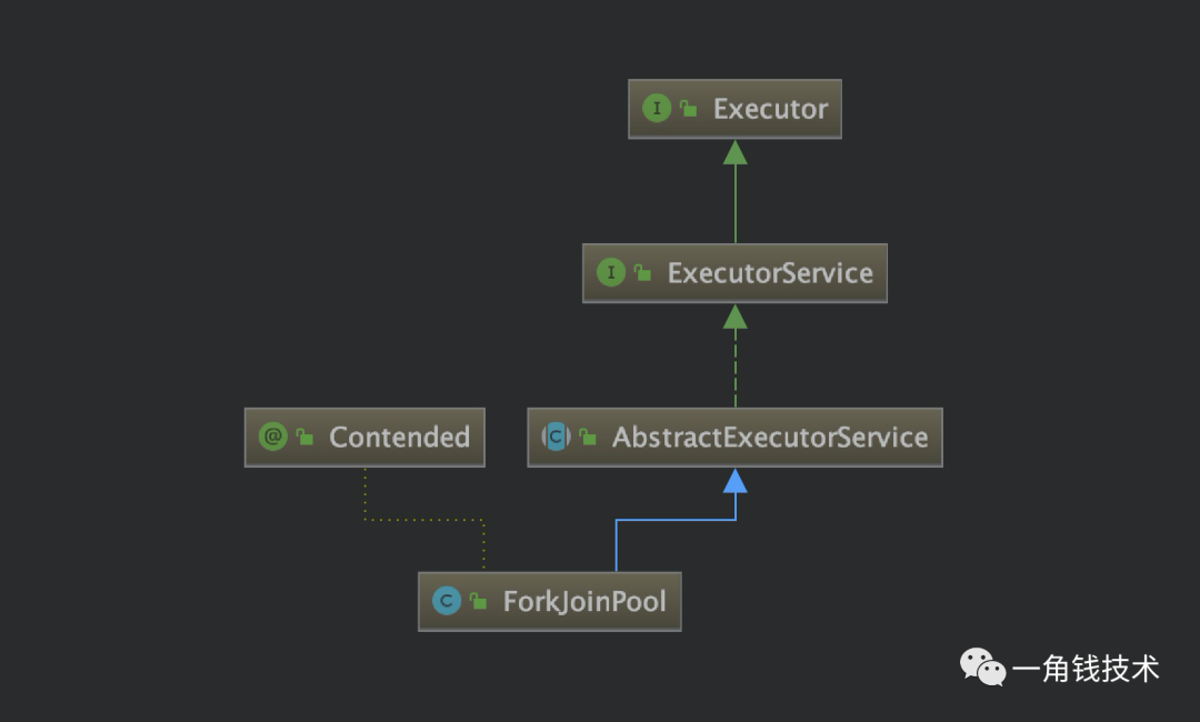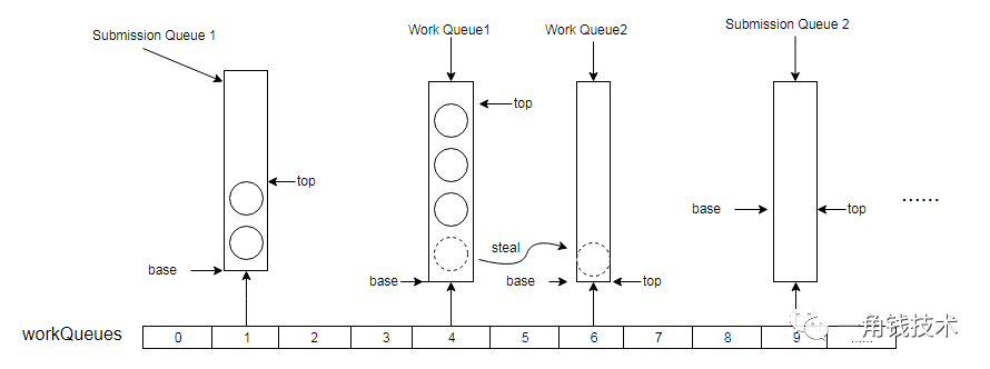 ForkJoinPool 自身拥有工作队列,这些工作队列的作用是用来接收由外部线程(非 ForkJoinThread 线程)提交过来的任务,而这些工作队列被称为 submitting queue 。submit() 和 fork() 其实没有本质区别,只是提交对象变成了 submitting queue 而已(还有一些同步,初始化的操作)。submitting queue 和其他 work queue 一样,是工作线程”窃取“的对象,因此当其中的任务被一个工作线程成功窃取时,就意味着提交的任务真正开始进入执行阶段。
