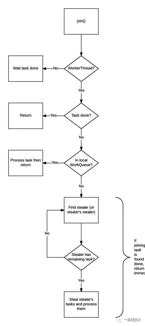 ForkJoinPool 的每个工作线程都维护着一个工作队列(WorkQueue),这是一个双端队列(Deque),里面存放的对象是任务(ForkJoinTask)。 每个工作线程在运行中产生新的任务(通常是因为调用了 fork())时,会放入工作队列的队尾,并且工作线程在处理自己的工作队列时,使用的是 LIFO 方式,也就是说每次从队尾取出任务来执行。 每个工作线程在处理自己的工作队列同时,会尝试窃取一个任务(或是来自于刚刚提交到 pool 的任务,或是来自于其他工作线程的工作队列),窃取的任务位于其他线程的工作队列的队首,也就是说工作线程在窃取其他工作线程的任务时,使用的是 FIFO 方式。 在遇到 join() 时,如果需要 join 的任务尚未完成,则会先处理其他任务,并等待其完成。 在既没有自己的任务,也没有可以窃取的任务时,进入休眠。