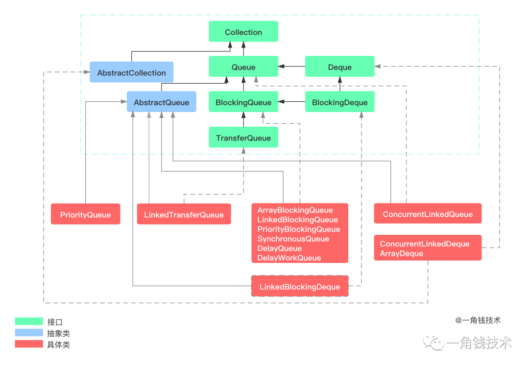 可以看到 BlockingQueue 是一个接口,继承它的另外还有两个接口 BlockingDeque(双端队列)、TransferQueue(两个线程之间传递元素)。