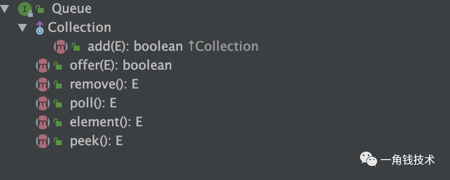 Queue:队列的上层接口,提供了插入、删除、获取元素这3种类型的方法,而且对每一种类型都提供了两种方式,先来看看插入方法: