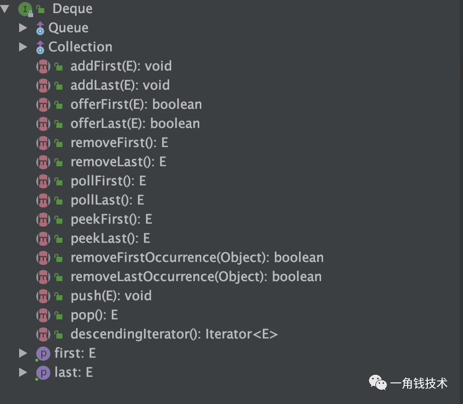 addFirst(E e):在前端插入元素,异常处理和add一样; addLast(E e):在后端插入元素,和add一样的效果; offerFirst(E e):在前端插入元素,异常处理和offer一样; offerLast(E e):在后端插入元素,和offer一样的效果; removeFirst():移除前端的一个元素,异常处理和remove一样; removeLast():移除后端的一个元素,和remove一样的效果; pollFirst():移除前端的一个元素,和poll一样的效果; pollLast():移除后端的一个元素,异常处理和poll一样; getFirst():获取前端的一个元素,和element一样的效果; getLast():获取后端的一个元素,异常处理和element一样; peekFirst():获取前端的一个元素,和peek一样的效果; peekLast():获取后端的一个元素,异常处理和peek一样; removeFirstOccurrence(Object o):从前端开始移除第一个是o的元素; removeLastOccurrence(Object o):从后端开始移除第一个是o的元素; push(E e):和addFirst一样的效果; pop():和removeFirst一样的效果。
