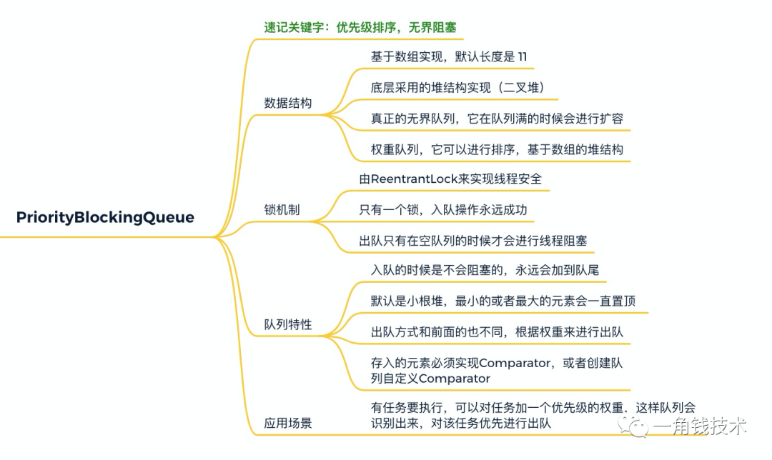 | PriorityBlockingQueue | unbounded | 加锁(只有一个锁,入队永远成功,出队会阻塞) | 数组(默认长度11,可扩容),底层采用的堆结构实现(二叉堆) |