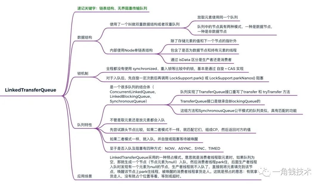 LinkedTransferQueue 是一个由链表结构组成的无界阻塞传输队列,它是一个很多队列的结合体(ConcurrentLinkedQueue,LinkedBlockingQueue,SynchronousQueue),在除了有基本阻塞队列的功能(但是这个阻塞队列没有使用锁)之外;队列实现了TransferQueue接口重写了transfer 和 tryTransfer 方法,这组方法和SynchronousQueue公平模式的队列类似,具有匹配的功能。