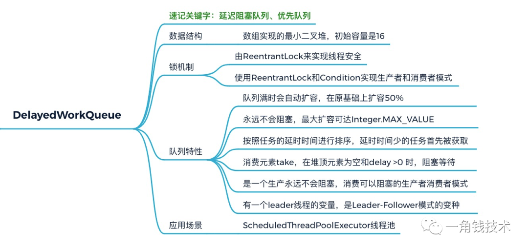 | DelayWorkQueue | unbounded | 加锁 | 数组(初始长度16,可扩容),底层采用的堆结构实现(二叉堆) |