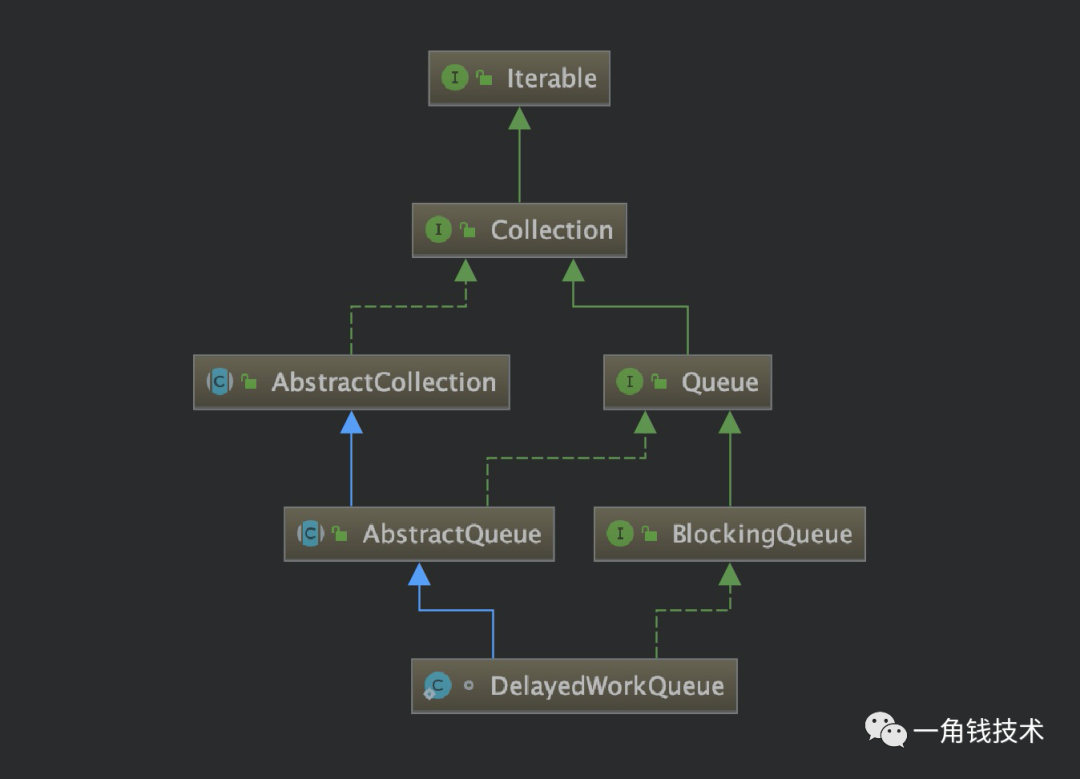 DelayedWorkQueue 也是一种设计为定时任务的延迟队列,它的实现和DelayQueue一样,不过是将优先级队列和DelayQueue的实现过程迁移到本身方法体中,从而可以在该过程当中灵活的加入定时任务特有的方法调用。