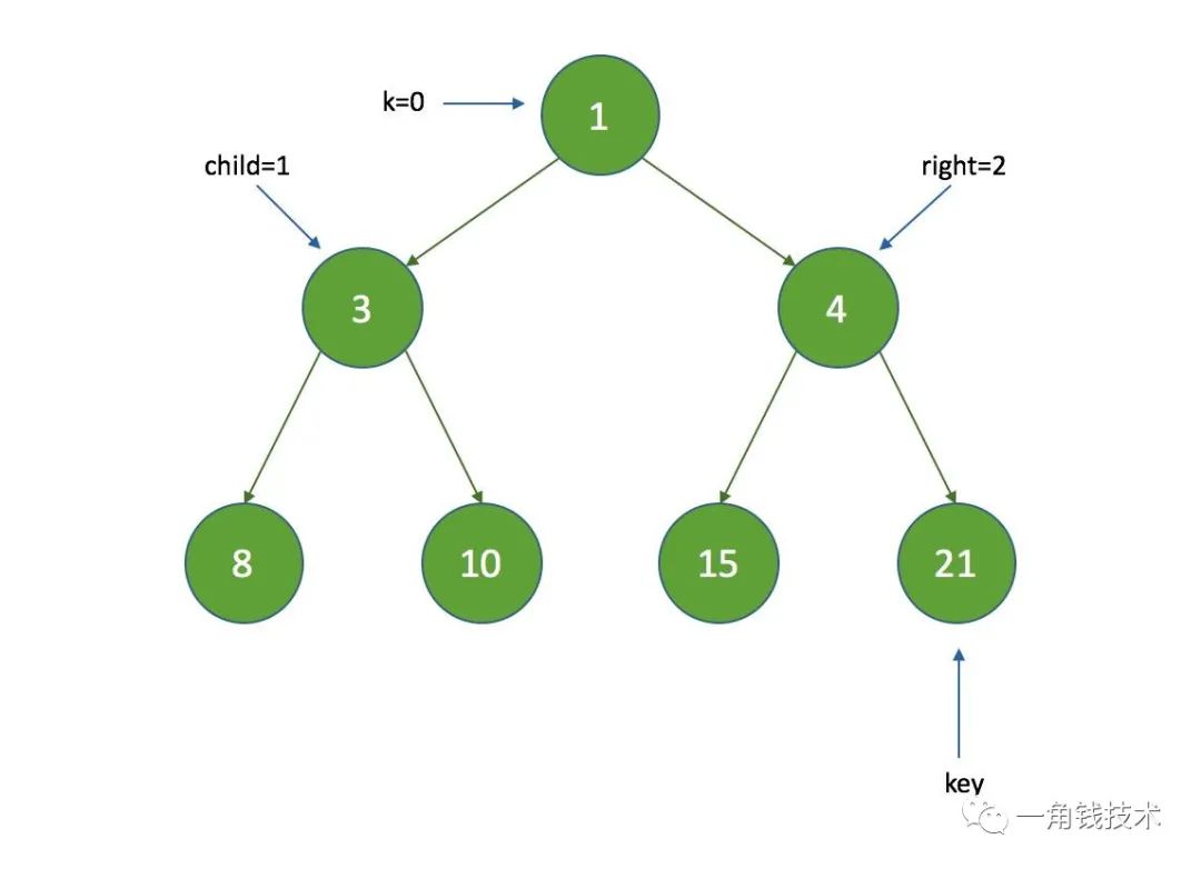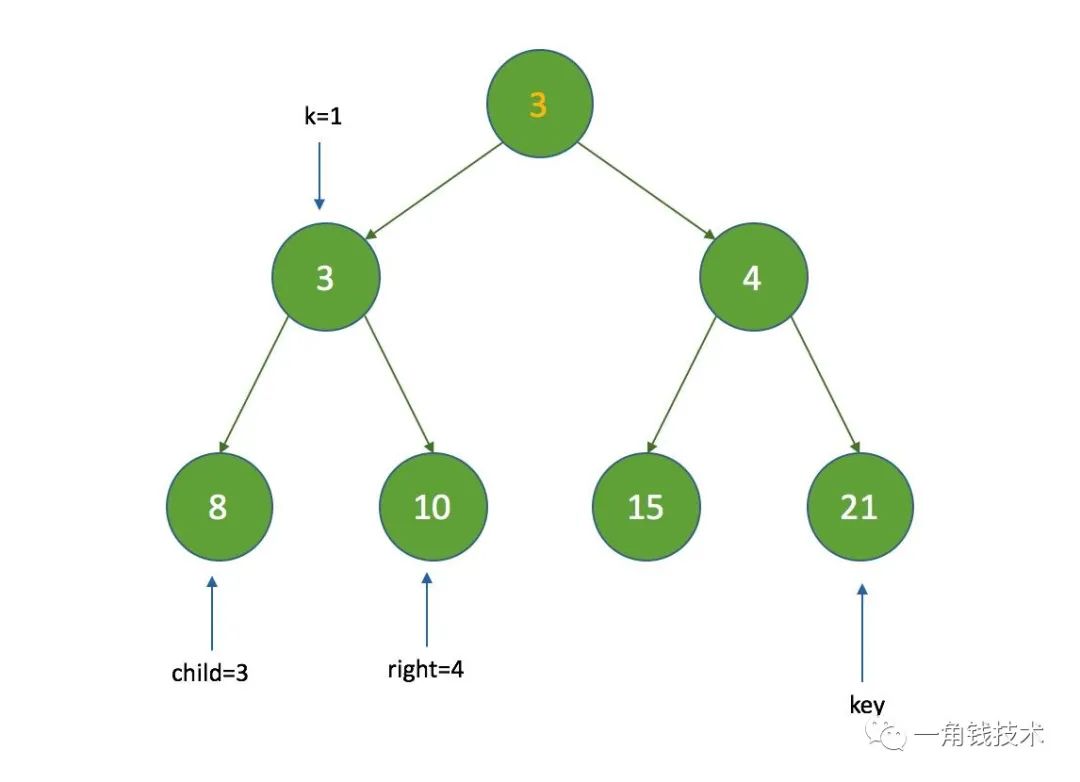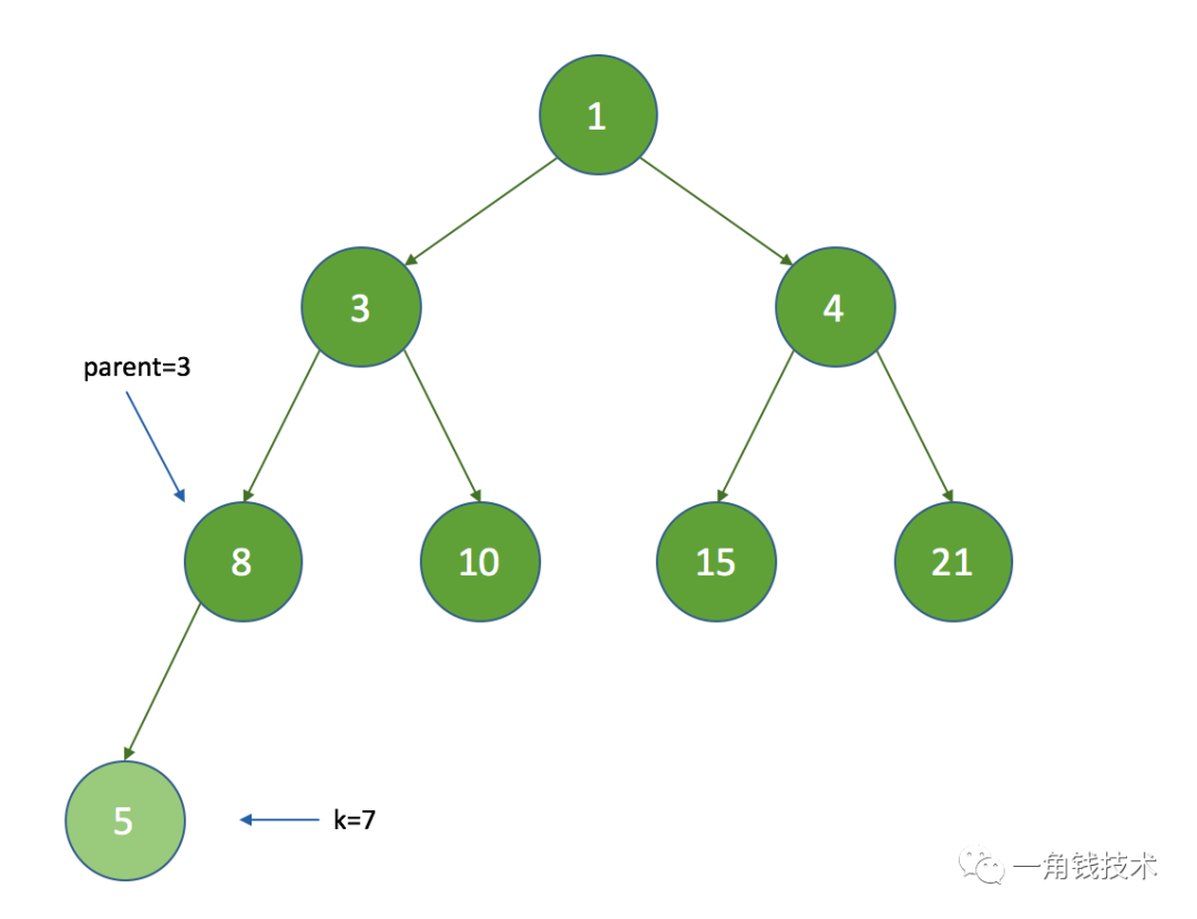 由于 right < size ,这时比较左子节点和右子节点时间间隔的大小,这里 3 < 7 ,所以 c = queue[child] ; 比较key的时间间隔是否小于c的时间间隔,这里不满足,继续执行,把索引为k的节点设置为c,然后将k设置为child;